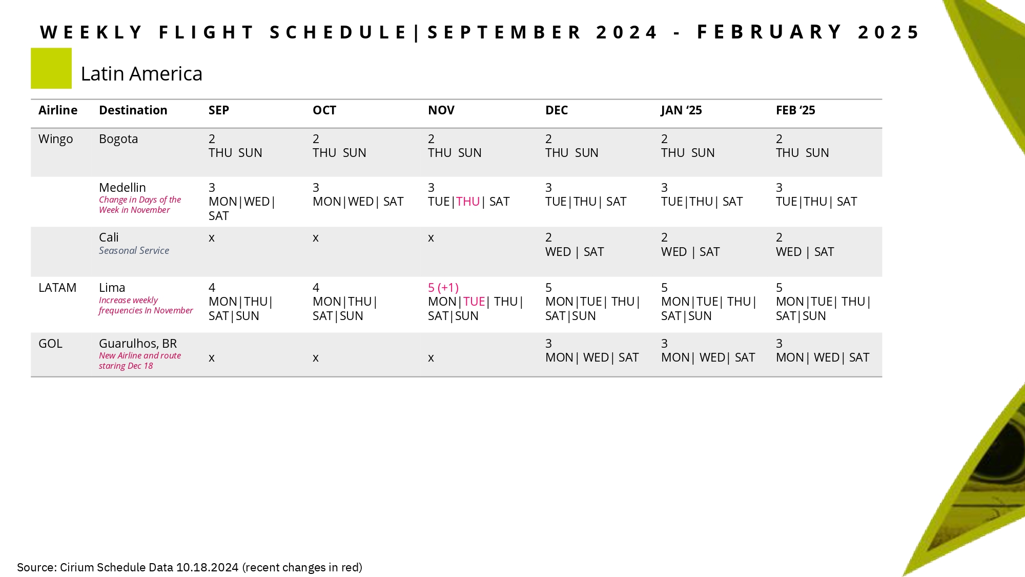 Latin American routes experienced notable growth in September 2024, with seat capacity rising by 14%. Avianca and Copa Airlines played significant roles in boosting traffic from major Latin American hubs like Bogota and Panama City. LATAM increased its frequency to Lima, and Surinam Airways saw an increase in passengers from Paramaribo.