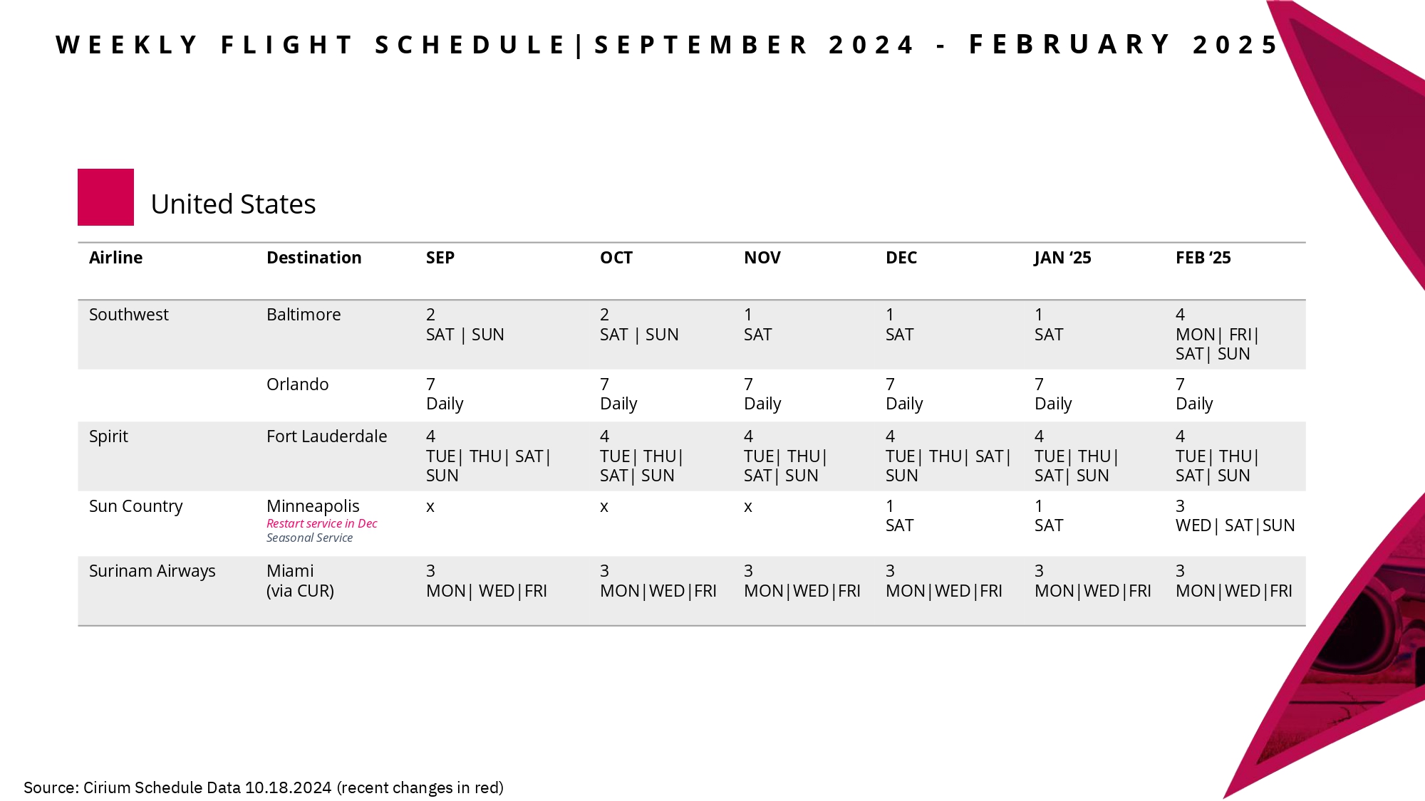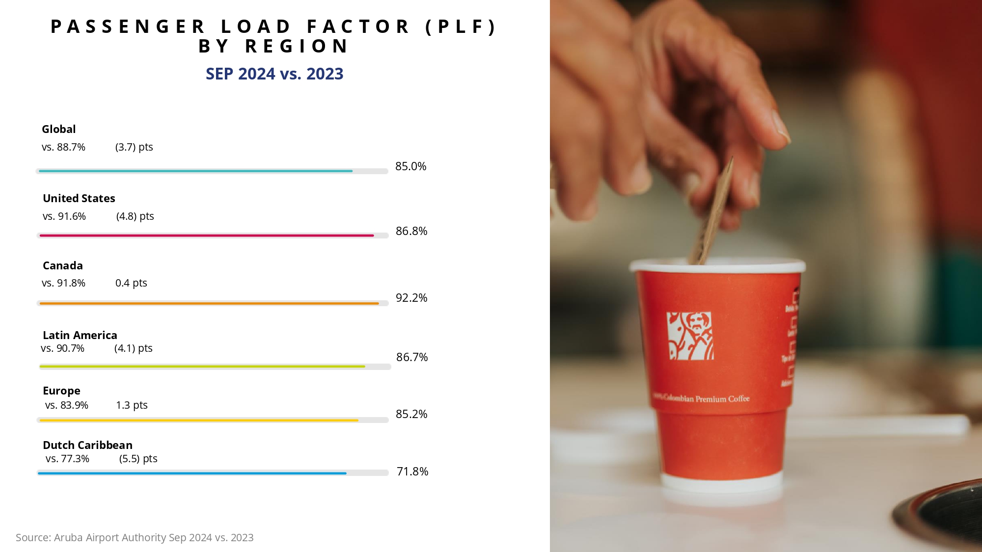 The United States continues to dominate the market, contributing 69% of revenue-generating passengers, while Canada and Europe held smaller but noteworthy shares of 7% and 6%, respectively. The Latin American and Caribbean region made up 18%, reflecting a 12% increase in seat capacity. Interestingly, the Dutch Caribbean showed a modest 5% market share, but with notable growth in seat capacity and passenger load factors.