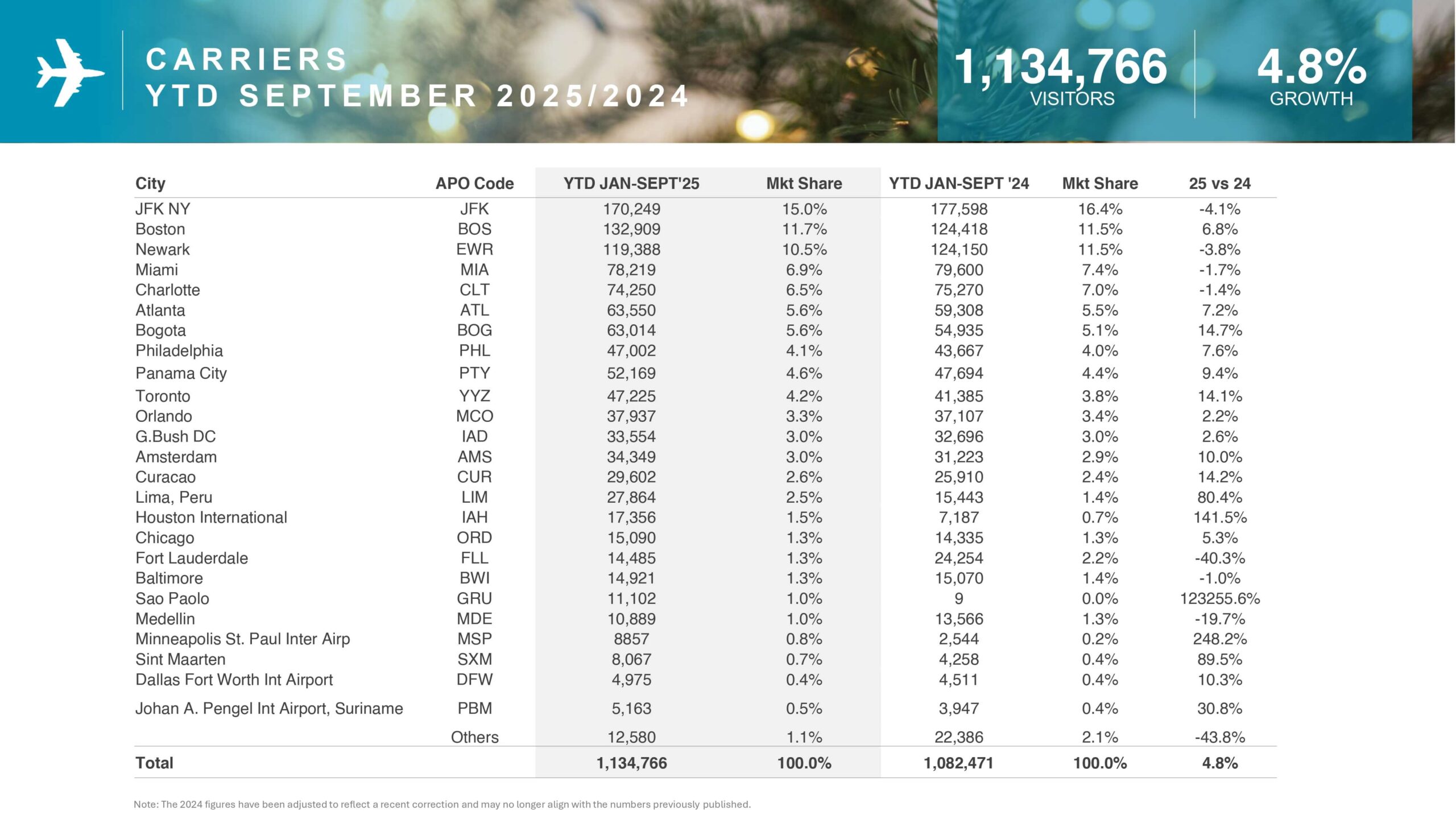 | Market | YTD September 2025 Arrivals | % Growth vs. 2024 |