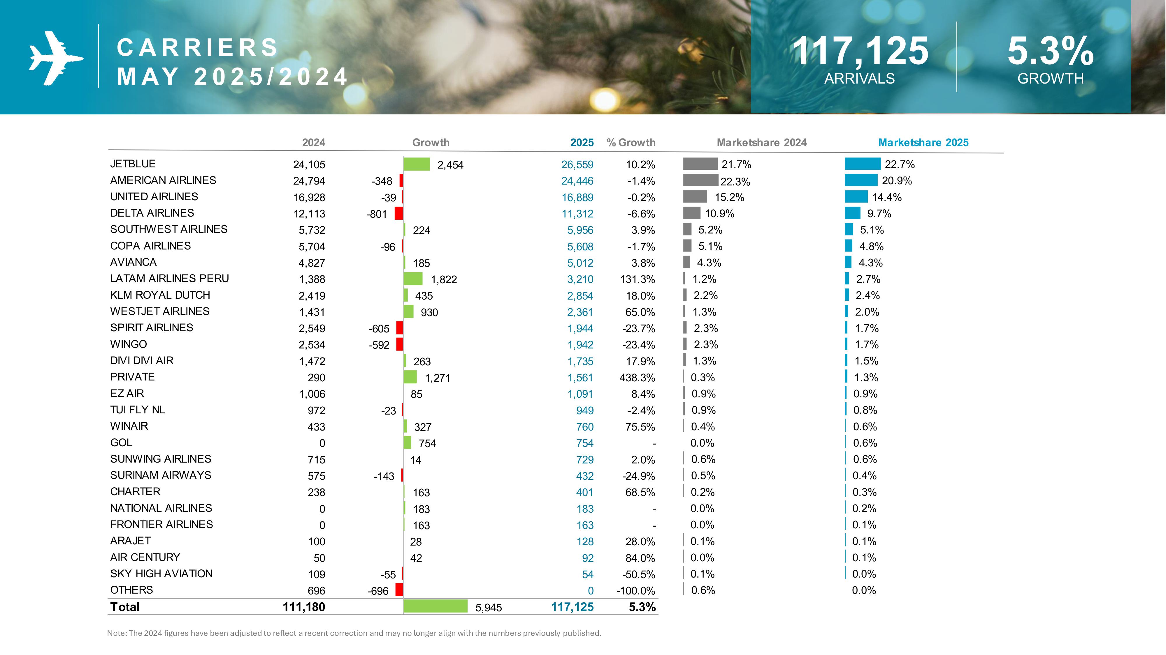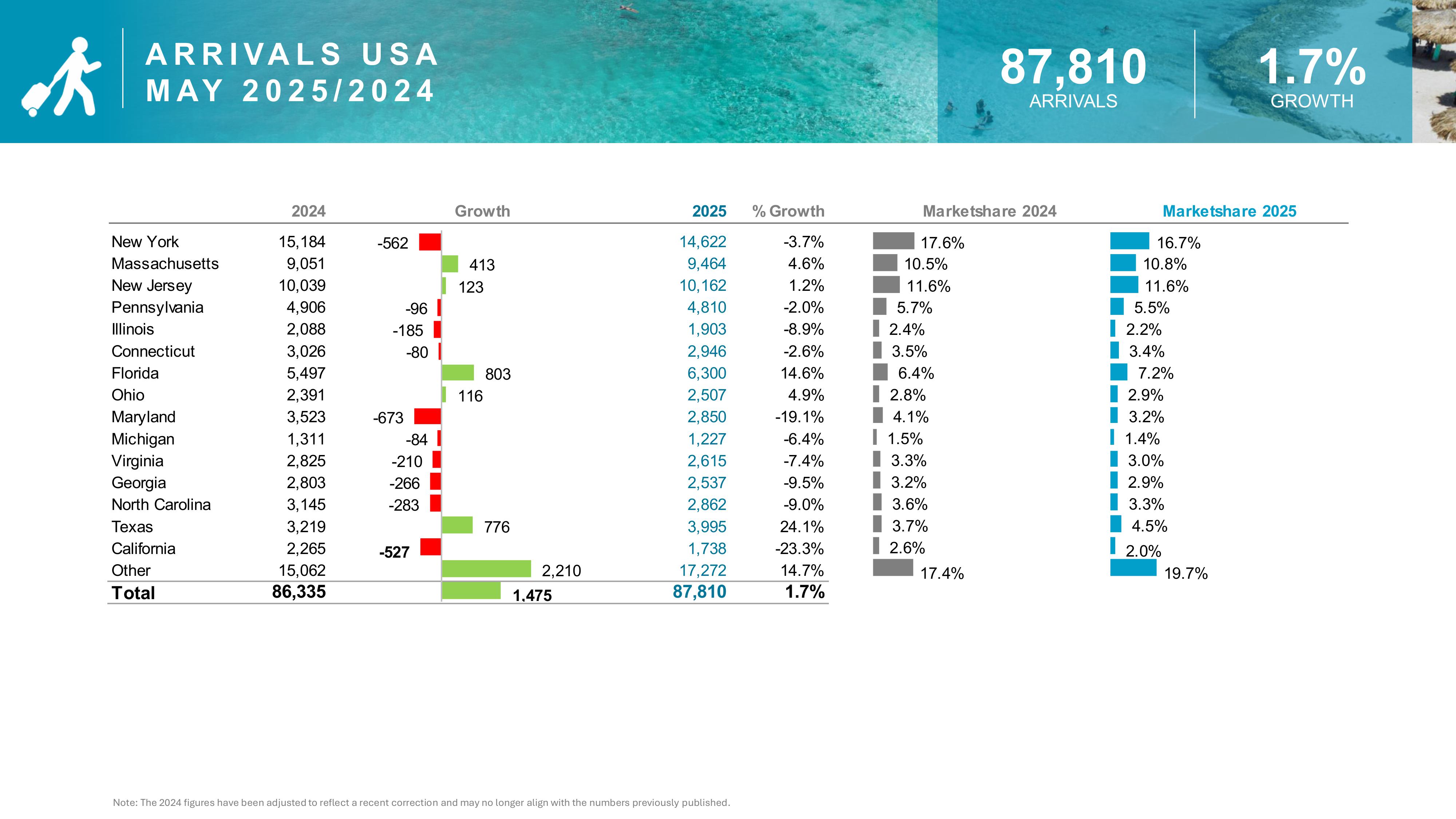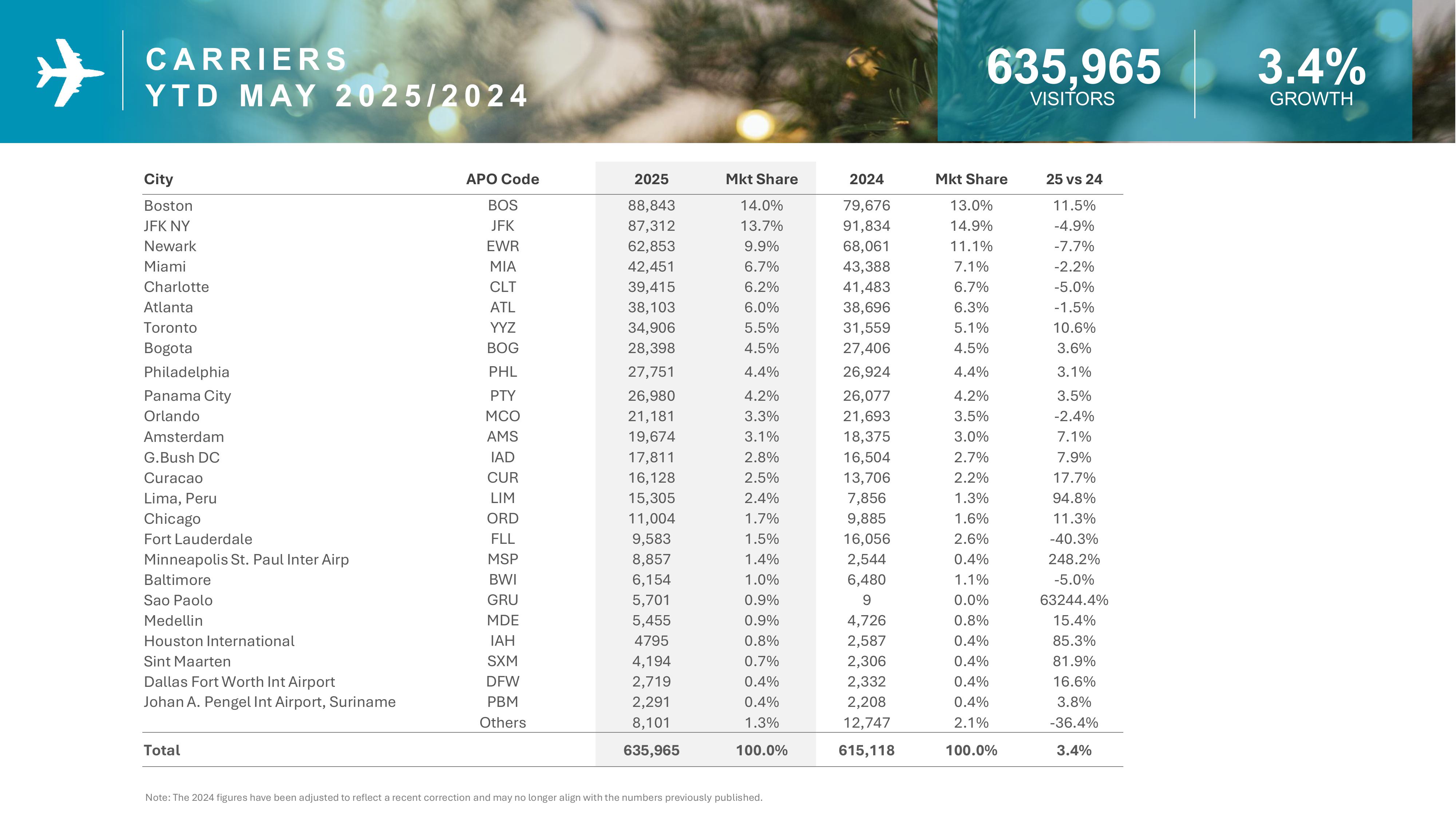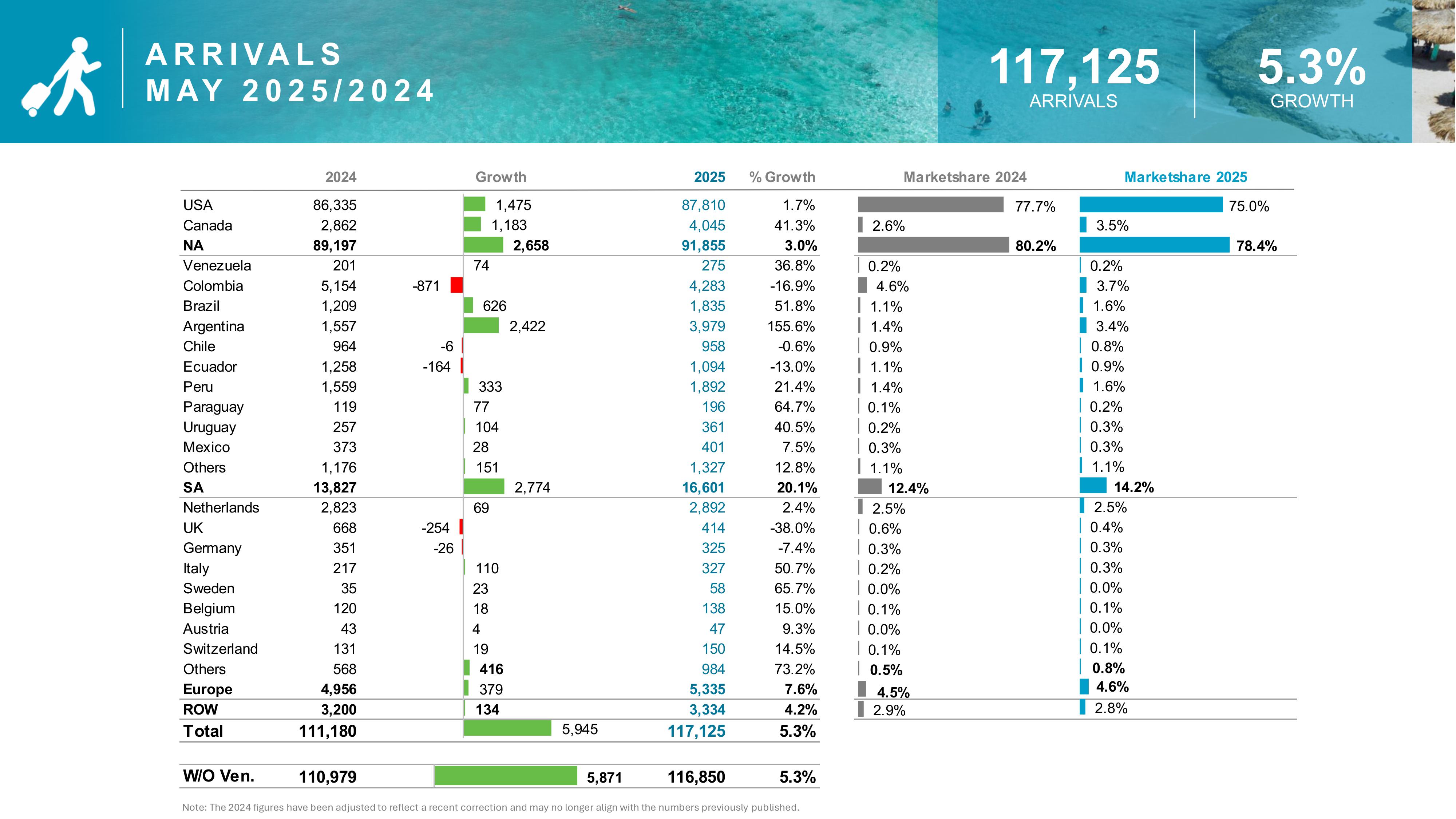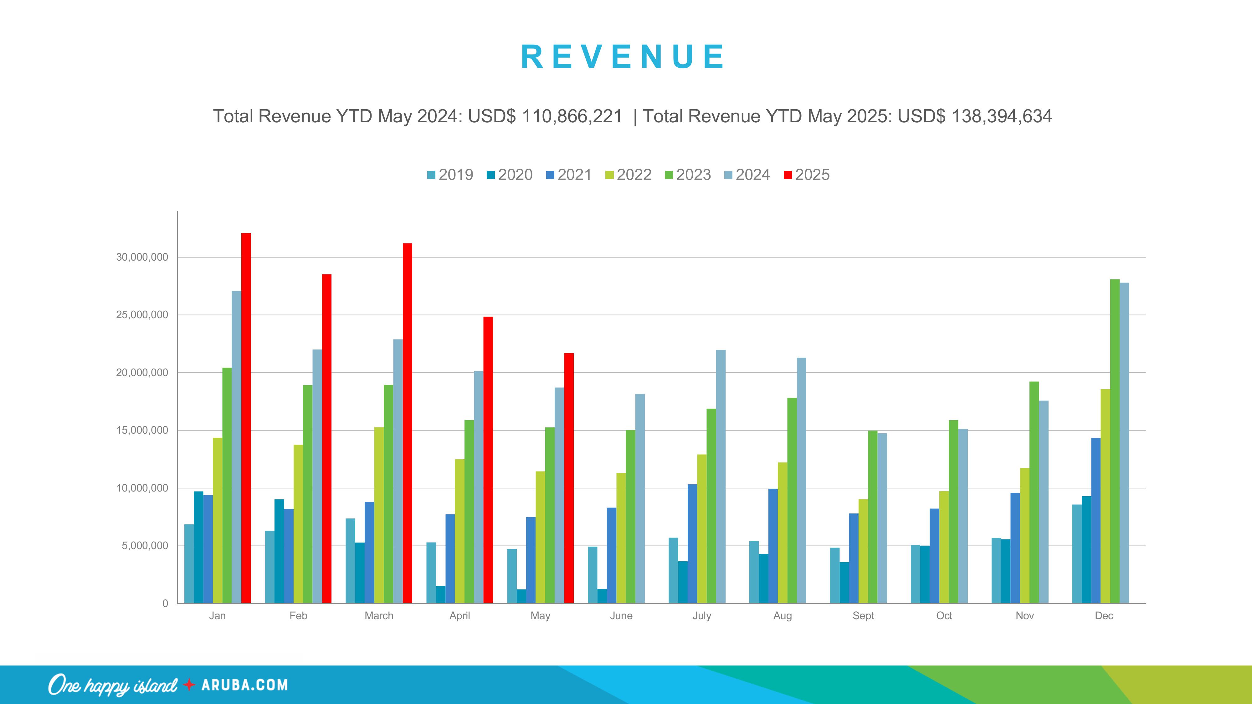 - Aruba welcomed nearly 21,000 more visitors YTD compared to 2024