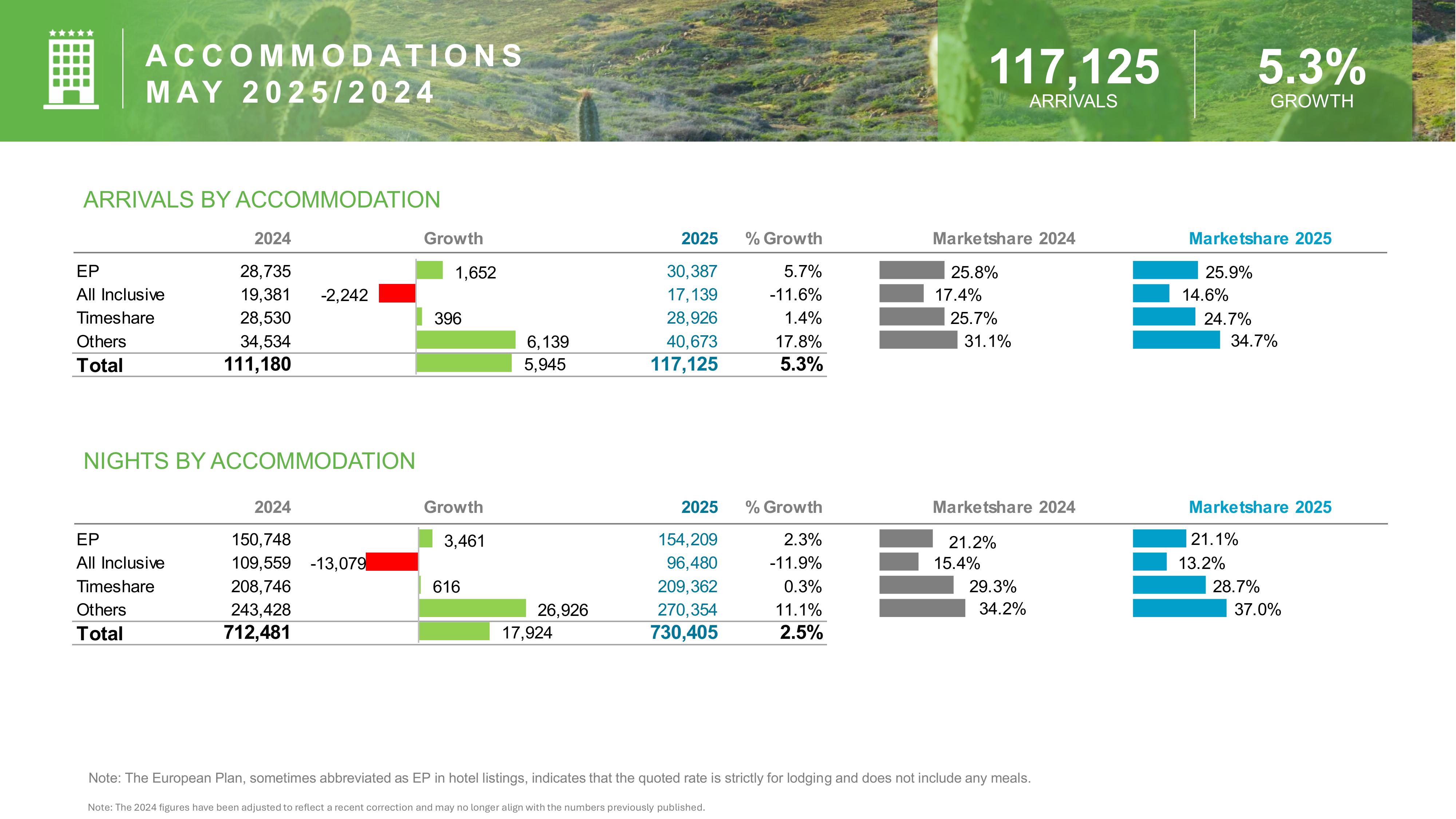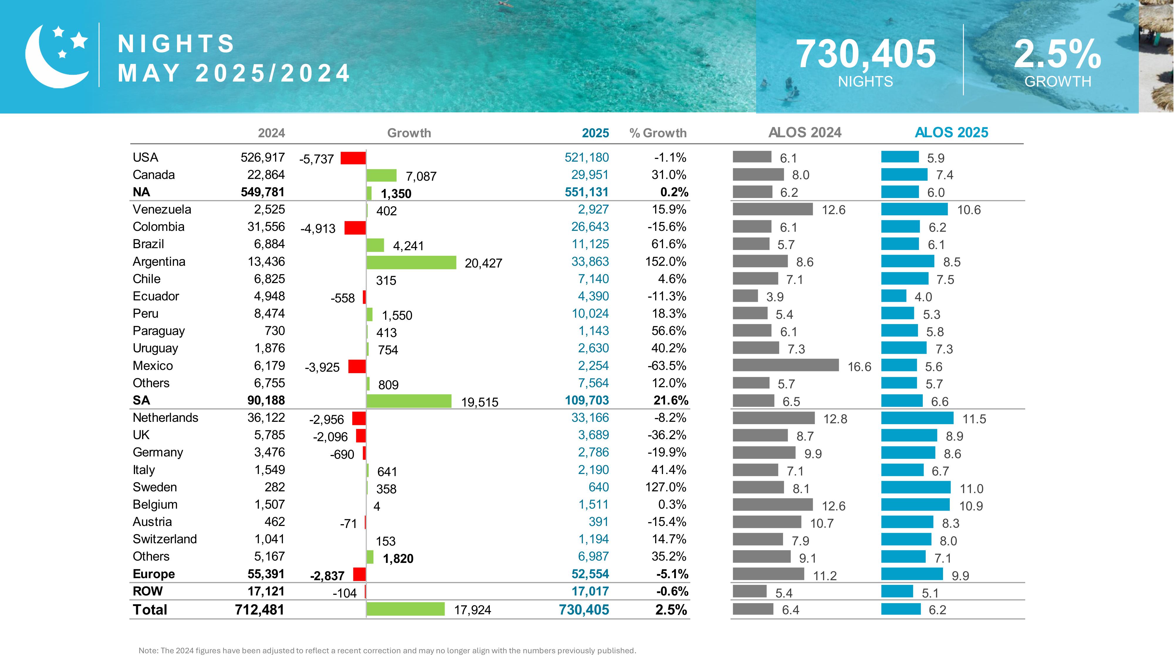 - Total visitor nights reached 730,405, a 2.5% increase