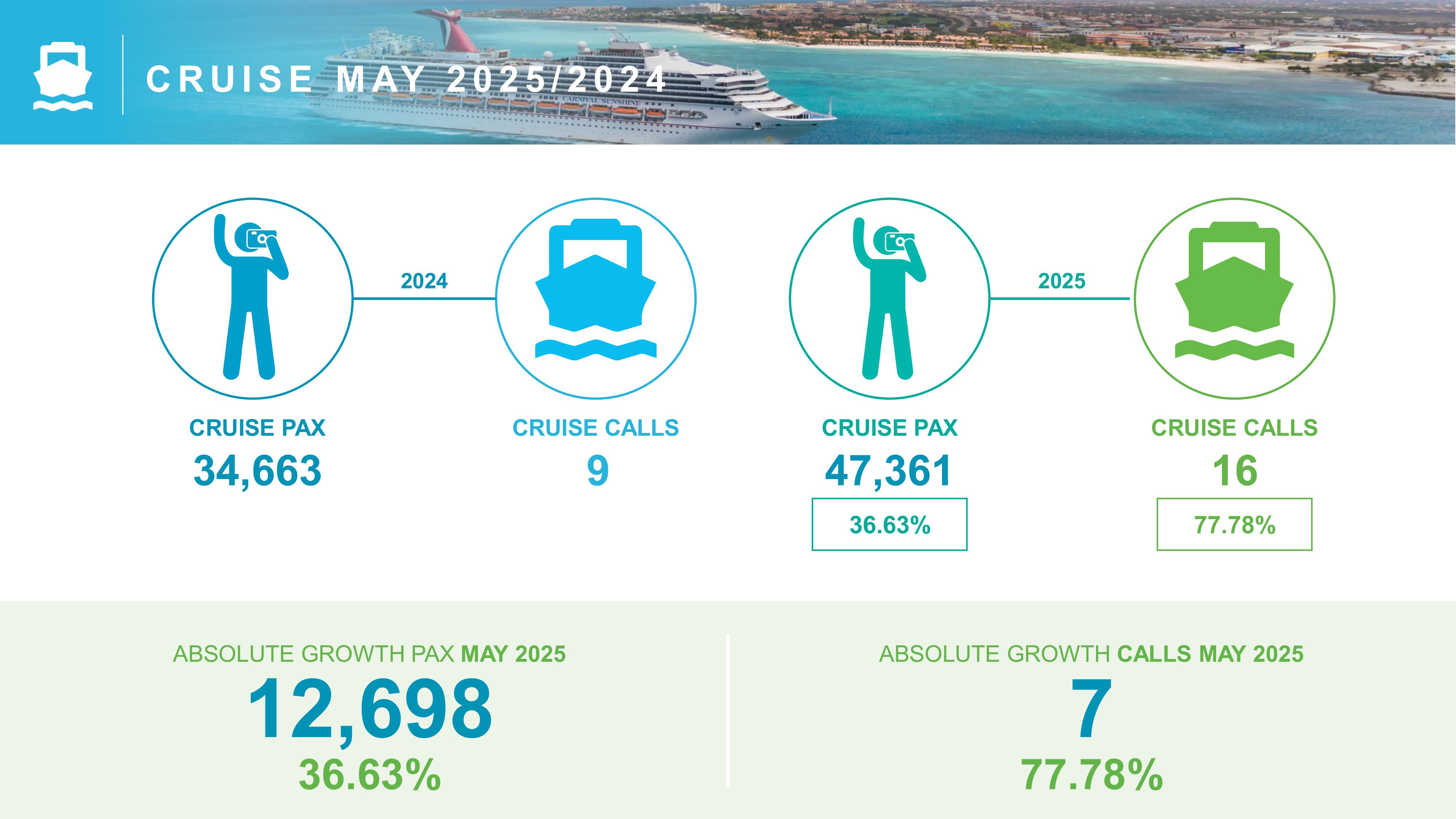 Aruba recorded 47,361 cruise visitors in May, exceeding the forecast by 10%. That’s a 36.6% jump from May 2024, thanks to seven additional cruise calls.