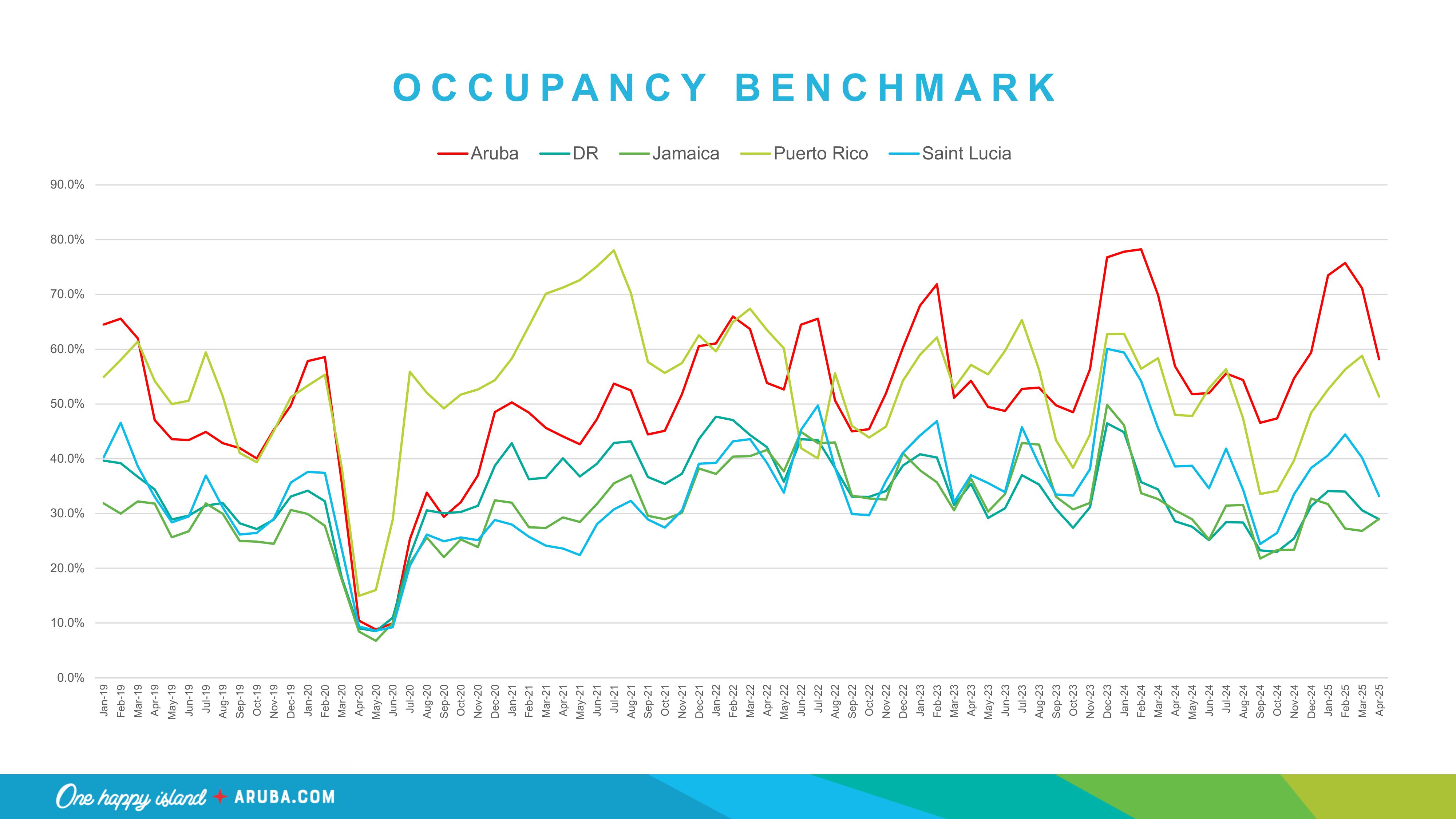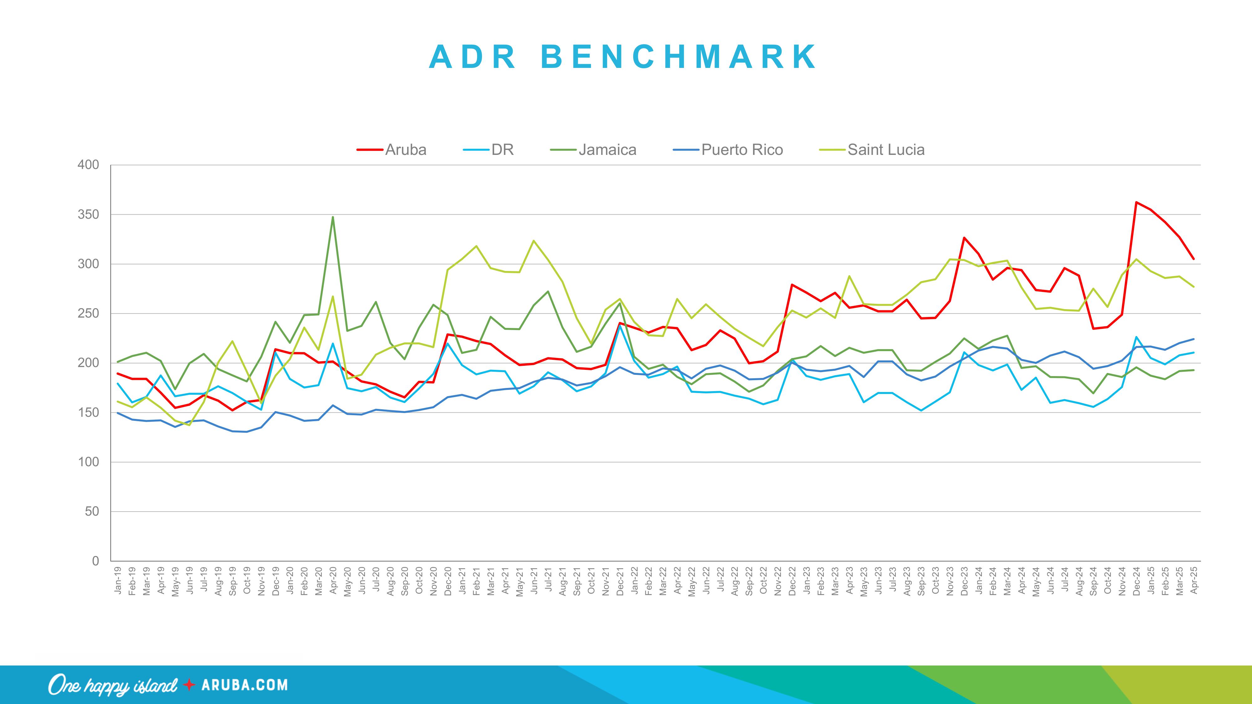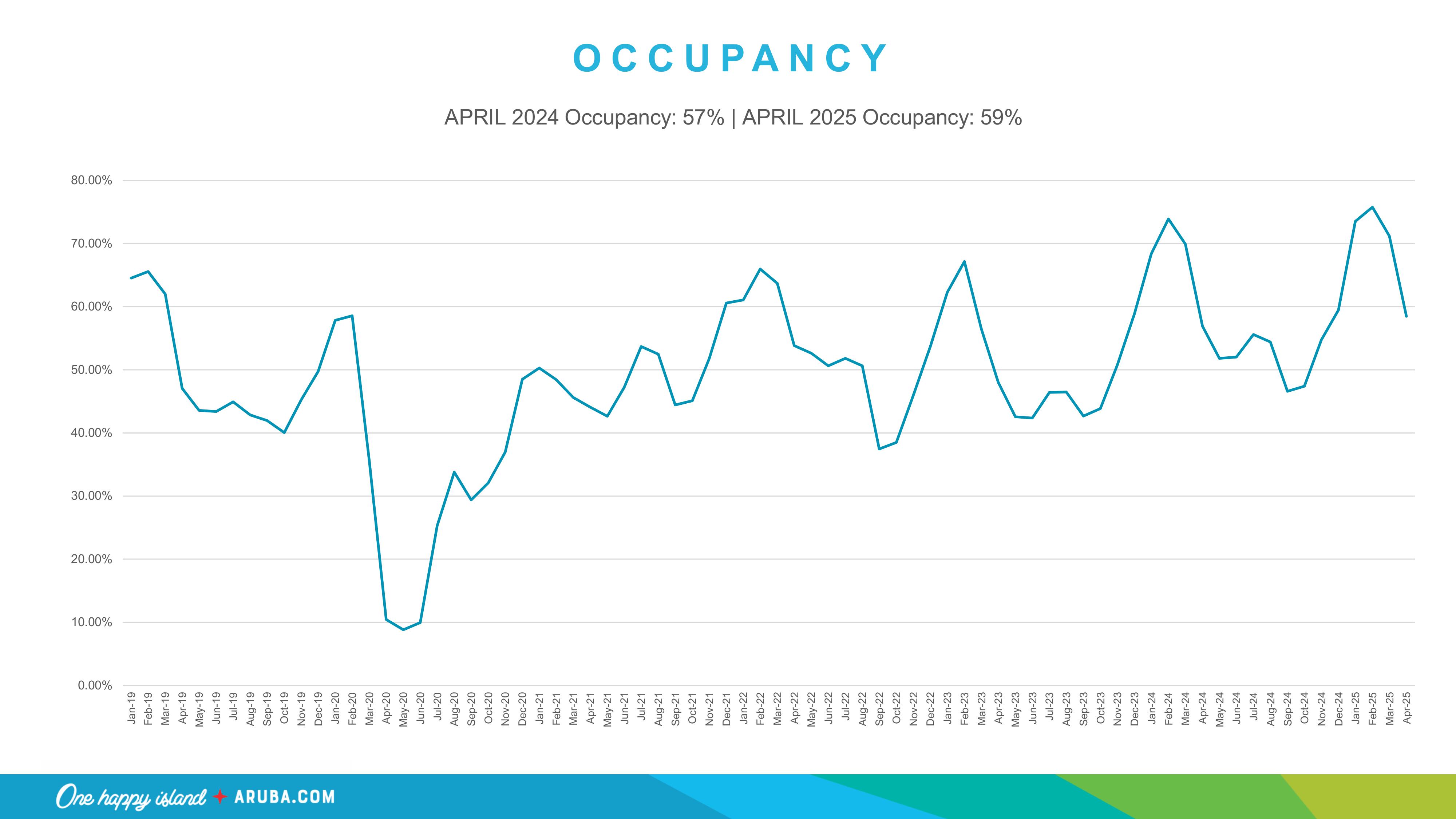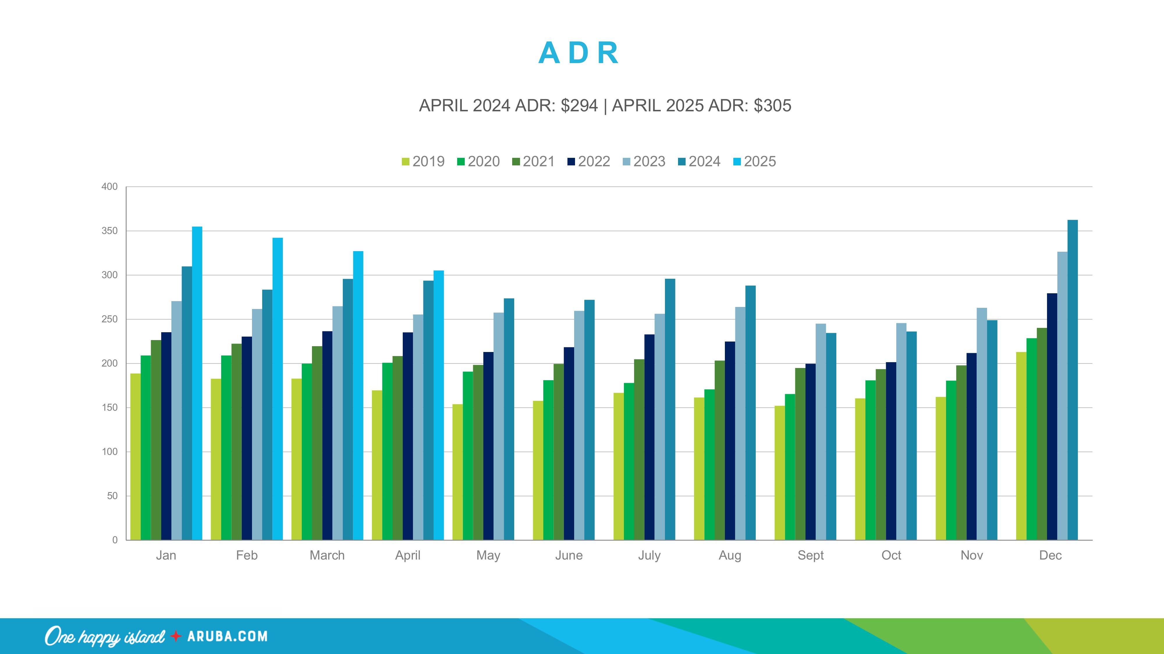 April 2025 recorded a 59% average occupancy rate, slightly up from 57% in 2024. The ADR (Average Daily Rate) also rose from $294 to $305, confirming that Aruba remains a high-value destination.