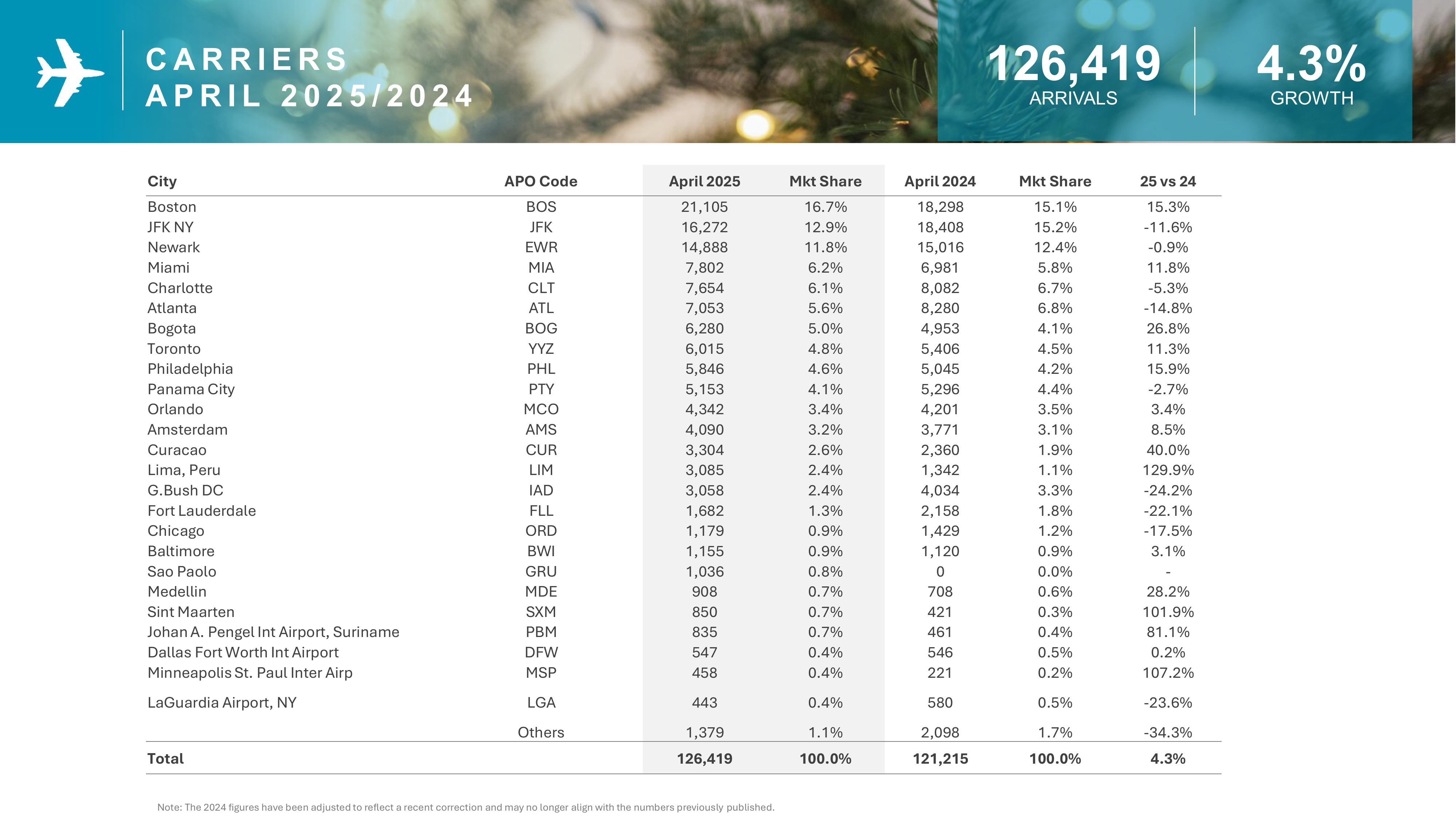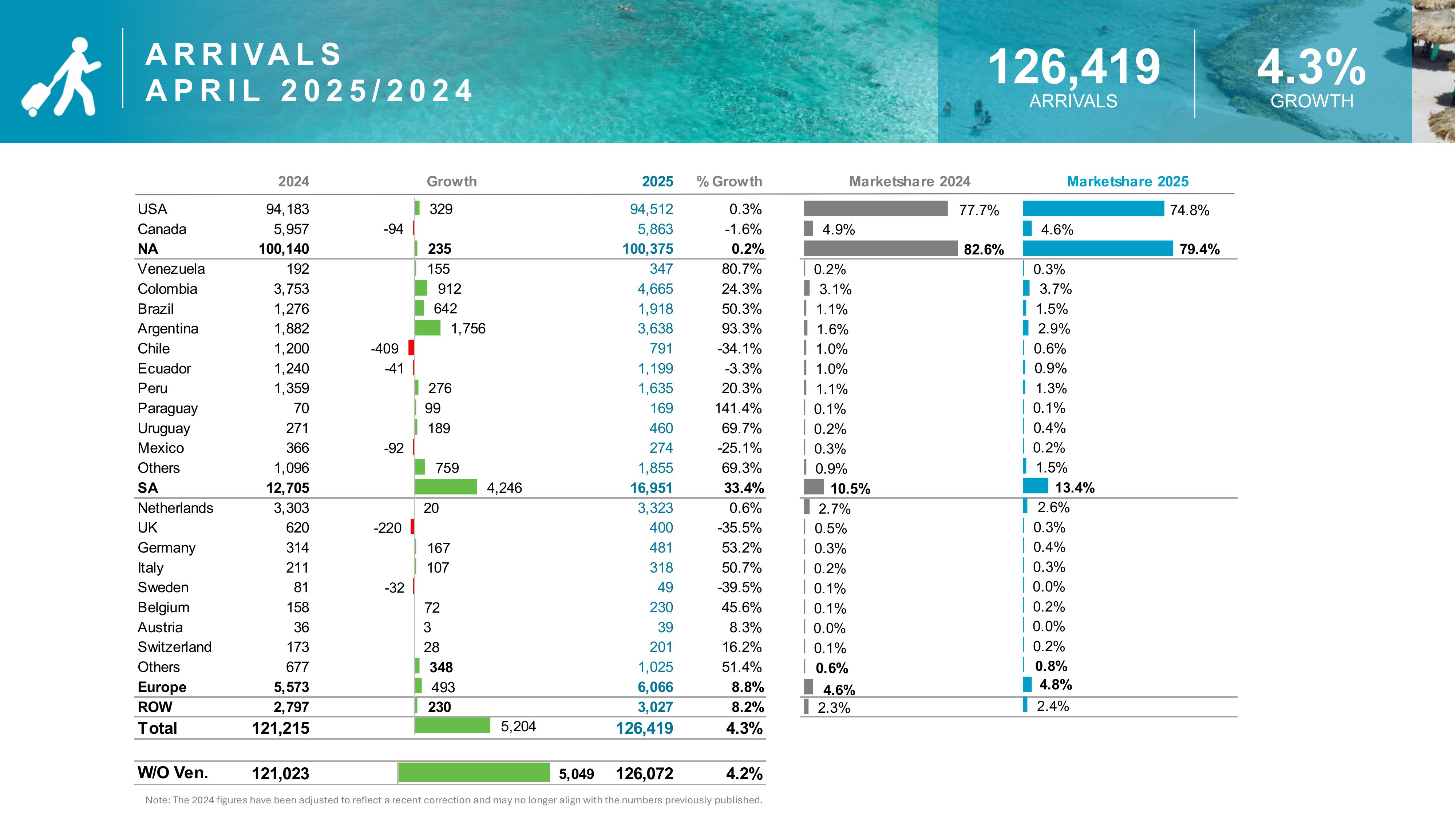 In April 2025, Aruba welcomed a total of 126,419 stay-over visitors, a 4.3% increase compared to 121,215 in April 2024. This growth was driven largely by increases from Argentina (+93.3%), Brazil (+50.3%), and Colombia (+24.3%). The United States maintained the lion’s share with 74.8% of market share, rising slightly by 0.3%.
