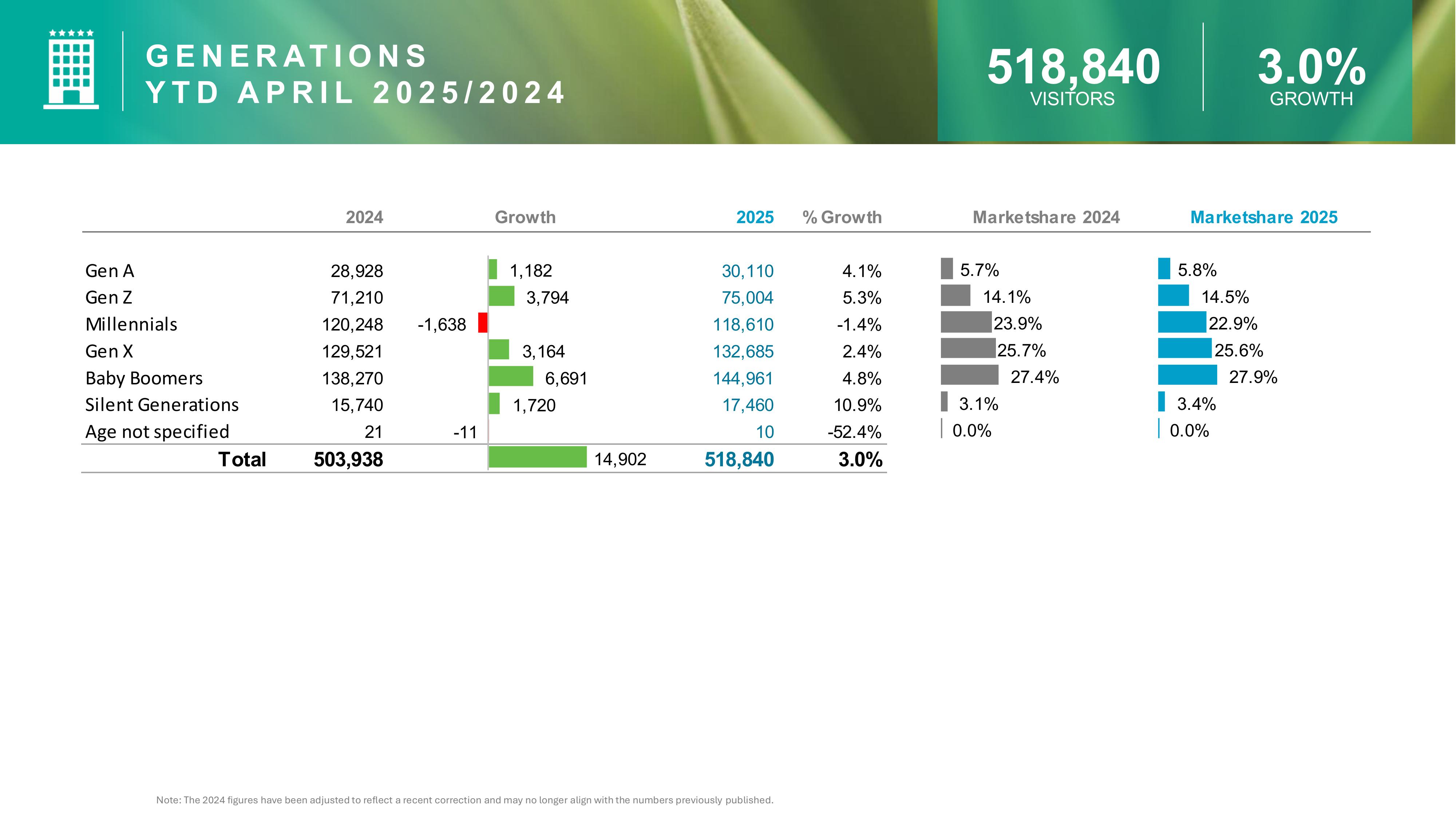 • Gen X and Baby Boomers make up over 50% of visitors