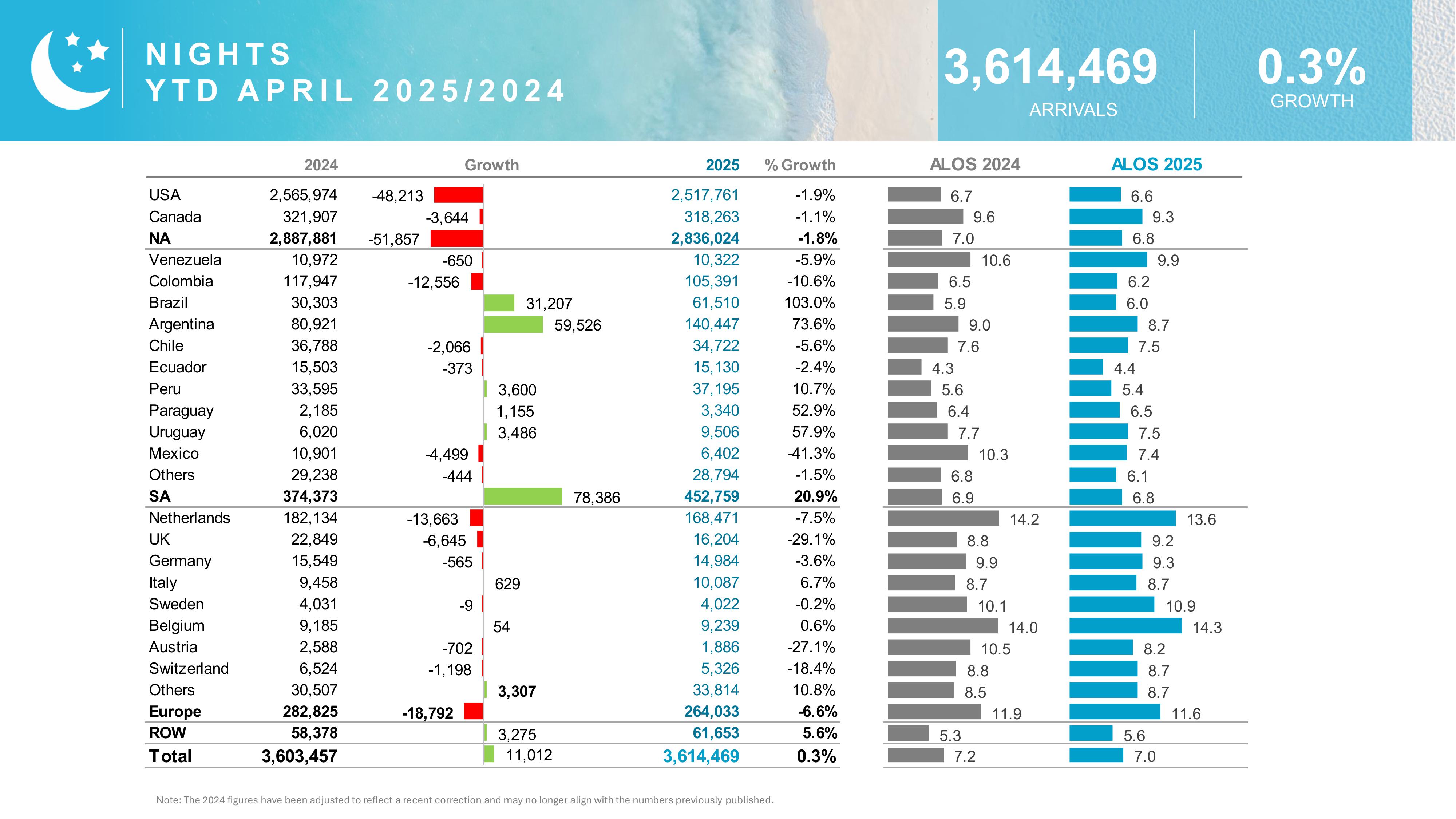 Visitors from North America comprised 79.4% of arrivals, while South America made up 13.4%, reflecting increasing interest from regional markets like Uruguay (+69.7%) and Paraguay (+141.4%).