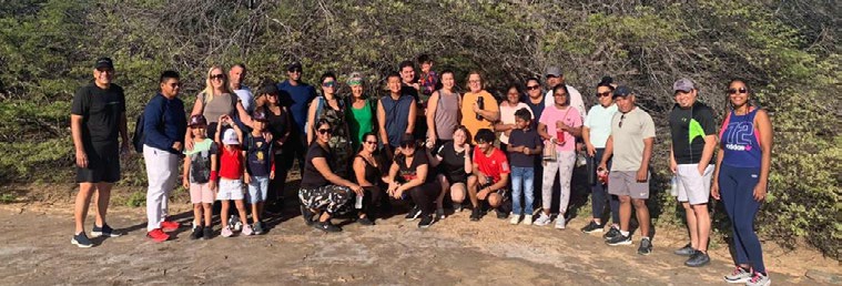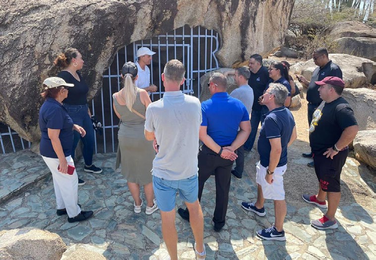Departing the resort in the morning, the team made their initial stop at the Alto Vista church. Here, they were treated to a brief but impactful presentation that emphasized the profound emotional and spiritual significance of this sacred location. Moving forward, they proceeded to the awe-inspiring AYO rock formation, a monumental site of Amerindian archaeology. It offered them a captivating glimpse into the authentic history and ancient rituals of Aruba’s early Indian inhabitants. The visit was expertly guided by Harold Kelly, a local authority on the subject, who shared enthralling insights and information with the team, enriching their experience further.