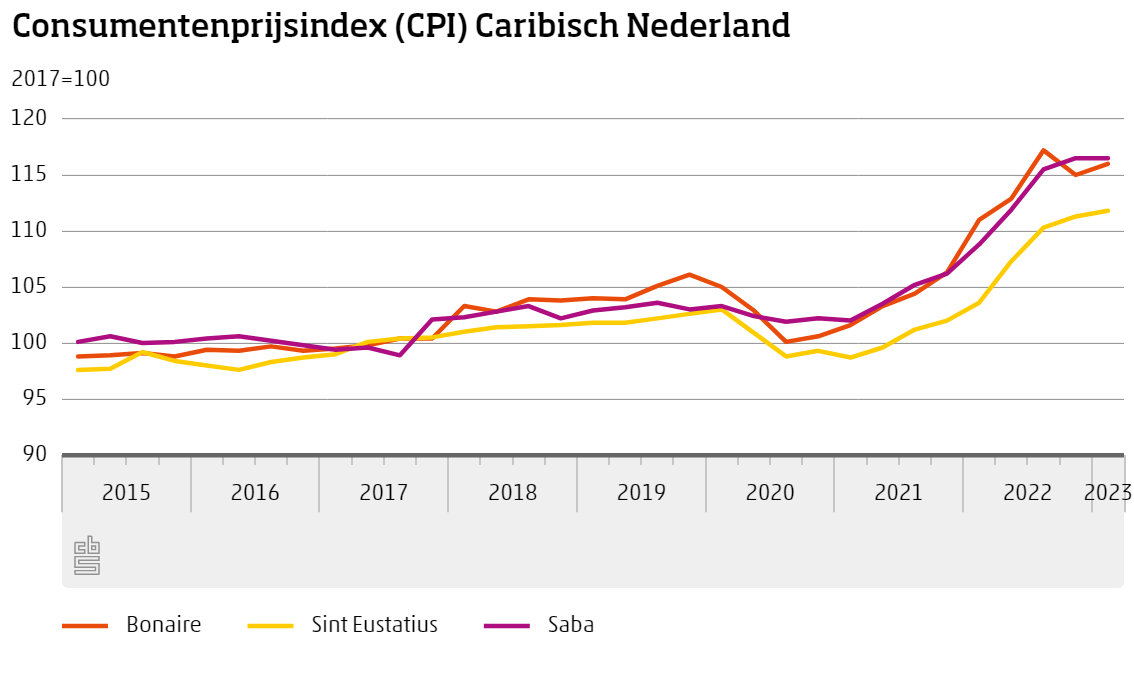 This does not mean that prices in the first quarter of 2023 also fell compared to the fourth quarter of 2022. Prices on Bonaire rose by 0.9 percent and on St Eustatius by 0.4 percent. Only Saba recorded a very slight price decrease: -0.1 percent in Q1 2023 relative to Q4 2022.