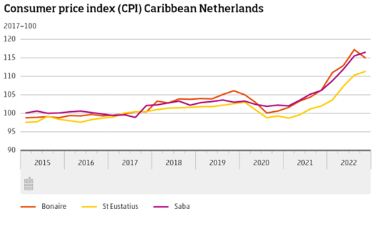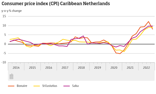 In 2022, Bonaire saw annual average price levels increase by 9.7 percent on the previous year. The annual year-on-year increase was 7.7 percent on St Eustatius and 8.6 percent on Saba.This was related to higher prices of food, transportation, housing, water and energy on all three islands.
